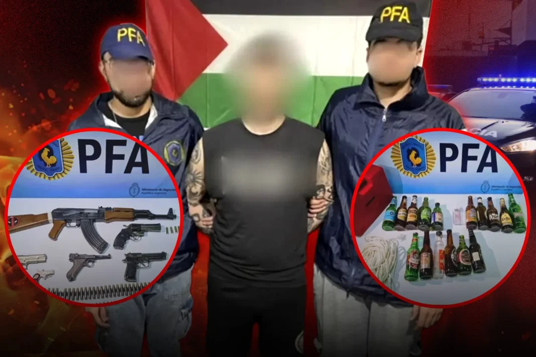 Asimismo, durante el procedimiento se confiscaron pins del presidente Javier Milei siendo asesinado, una bandera de Palestina, y dispositivos electrónicos que serán sometidos a análisis en los próximos días.